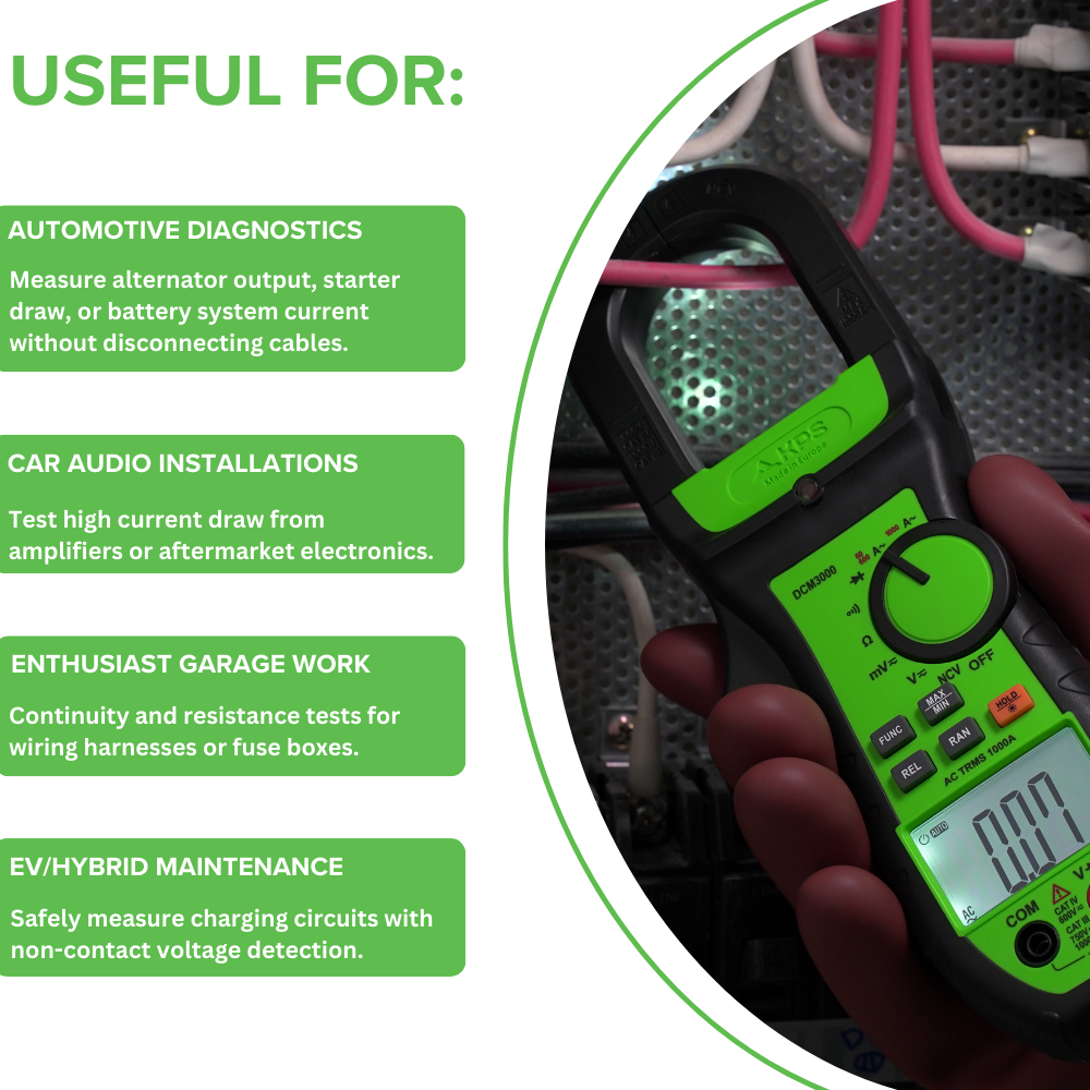 Measures AC/DC current up to 400A, voltage up to 600V, resistance, and continuity
